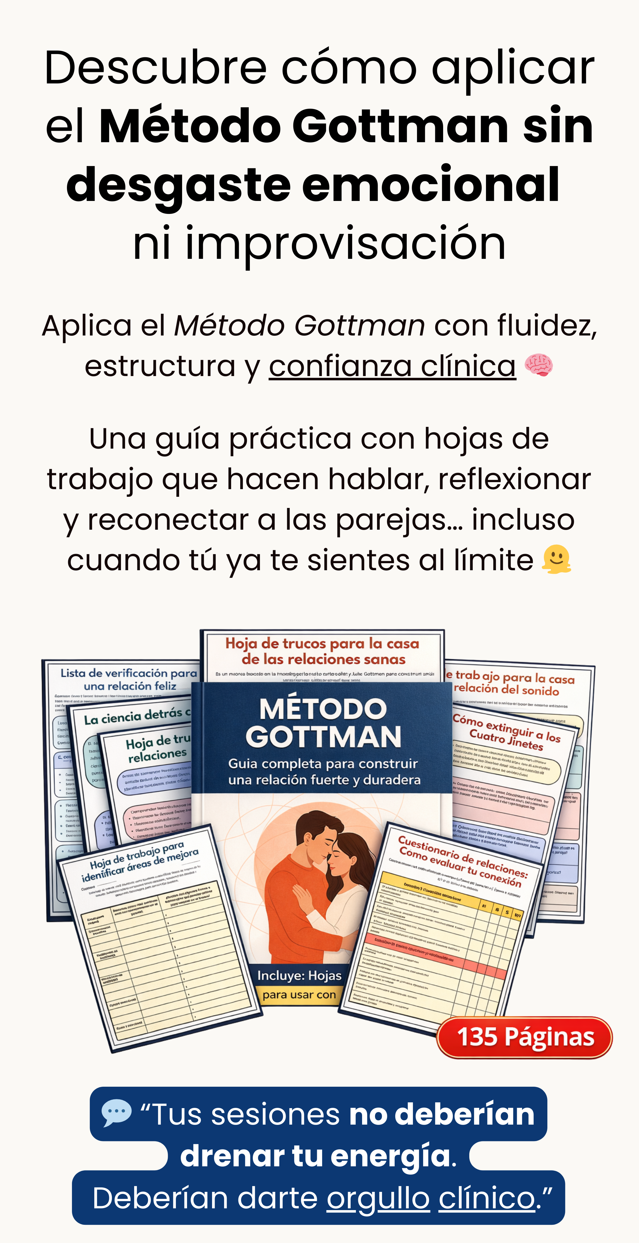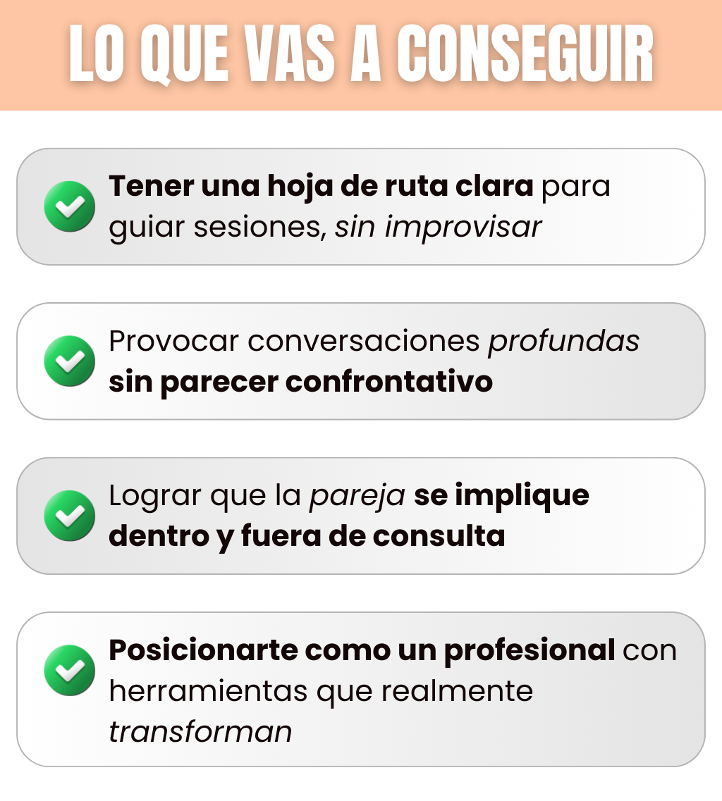 Sí. Está pensado para psicólogos/as y terapeutas (individual, pareja o familiar) que quieren una guía clara y aplicable para llevar sesiones con más estructura, profundidad y avances reales. Ideal si sentís que las sesiones se vuelven repetitivas o se estancan.